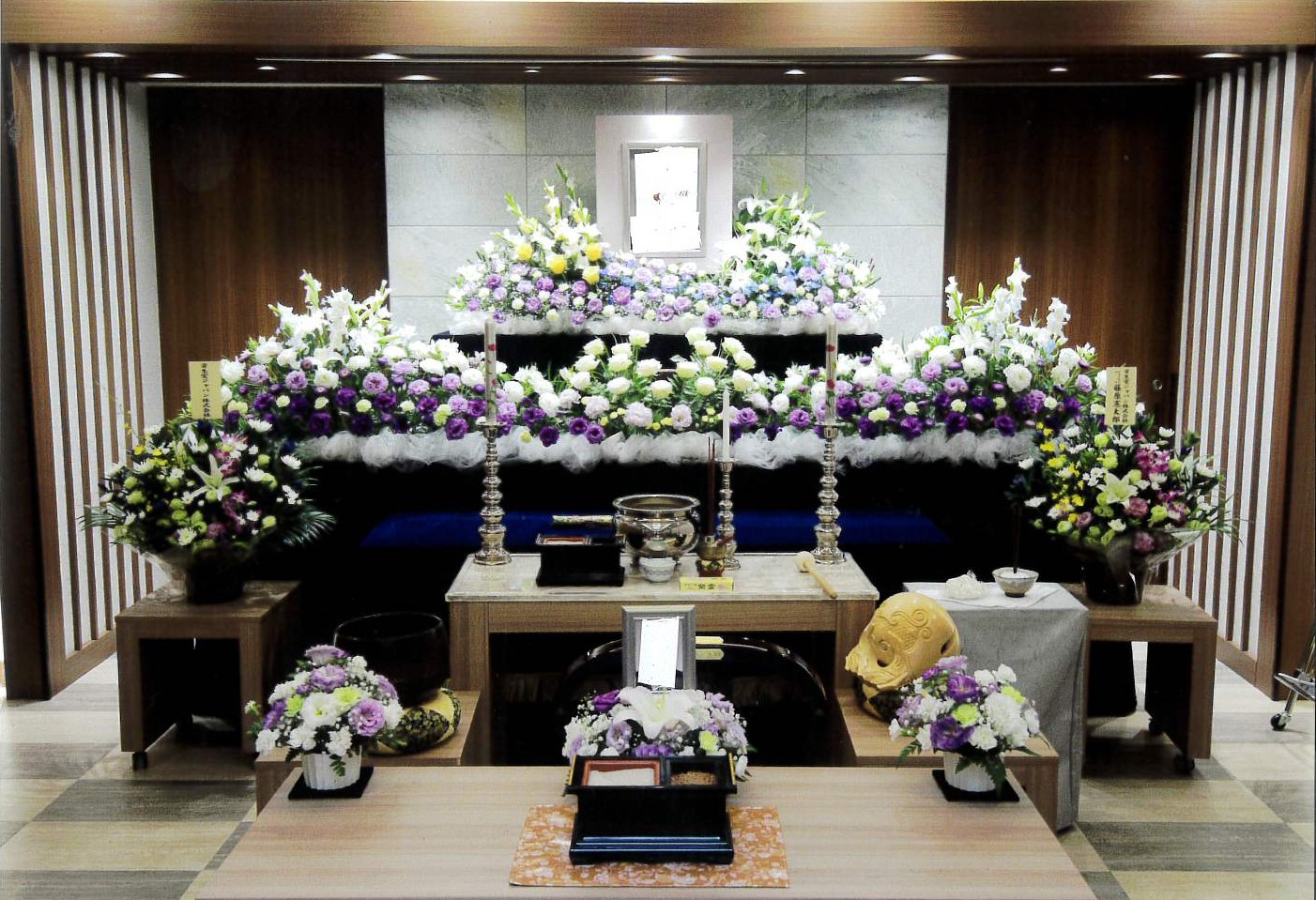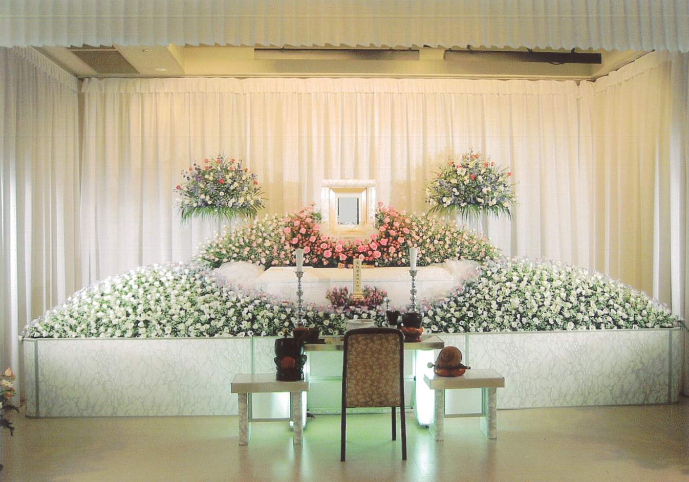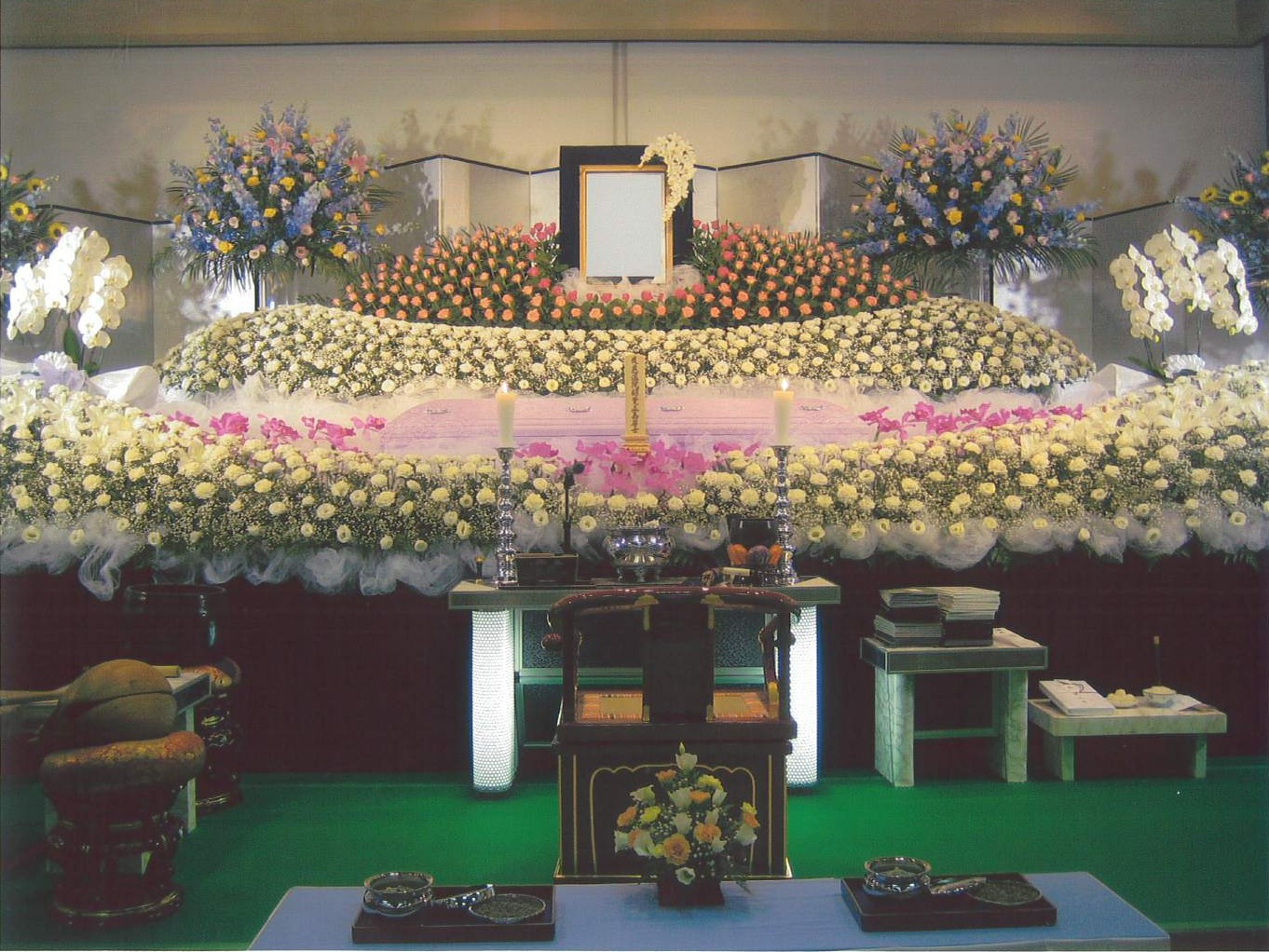 キャデラック霊柩車、蓮華寝棺、大理石または陶七宝の御収骨容器など、