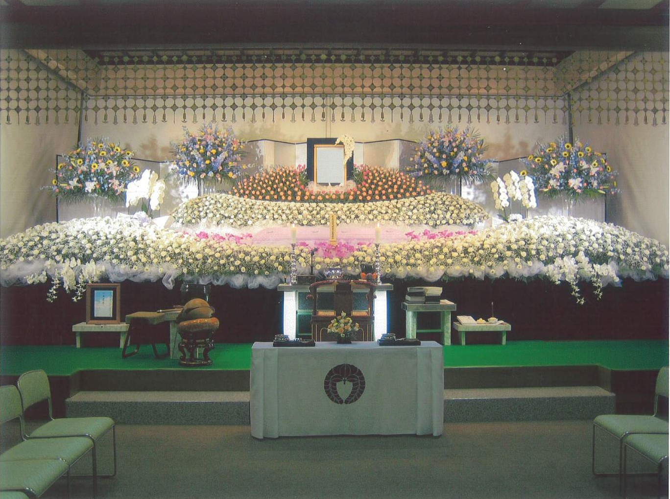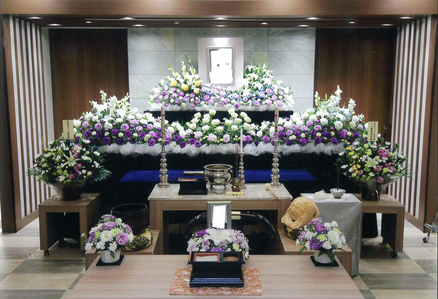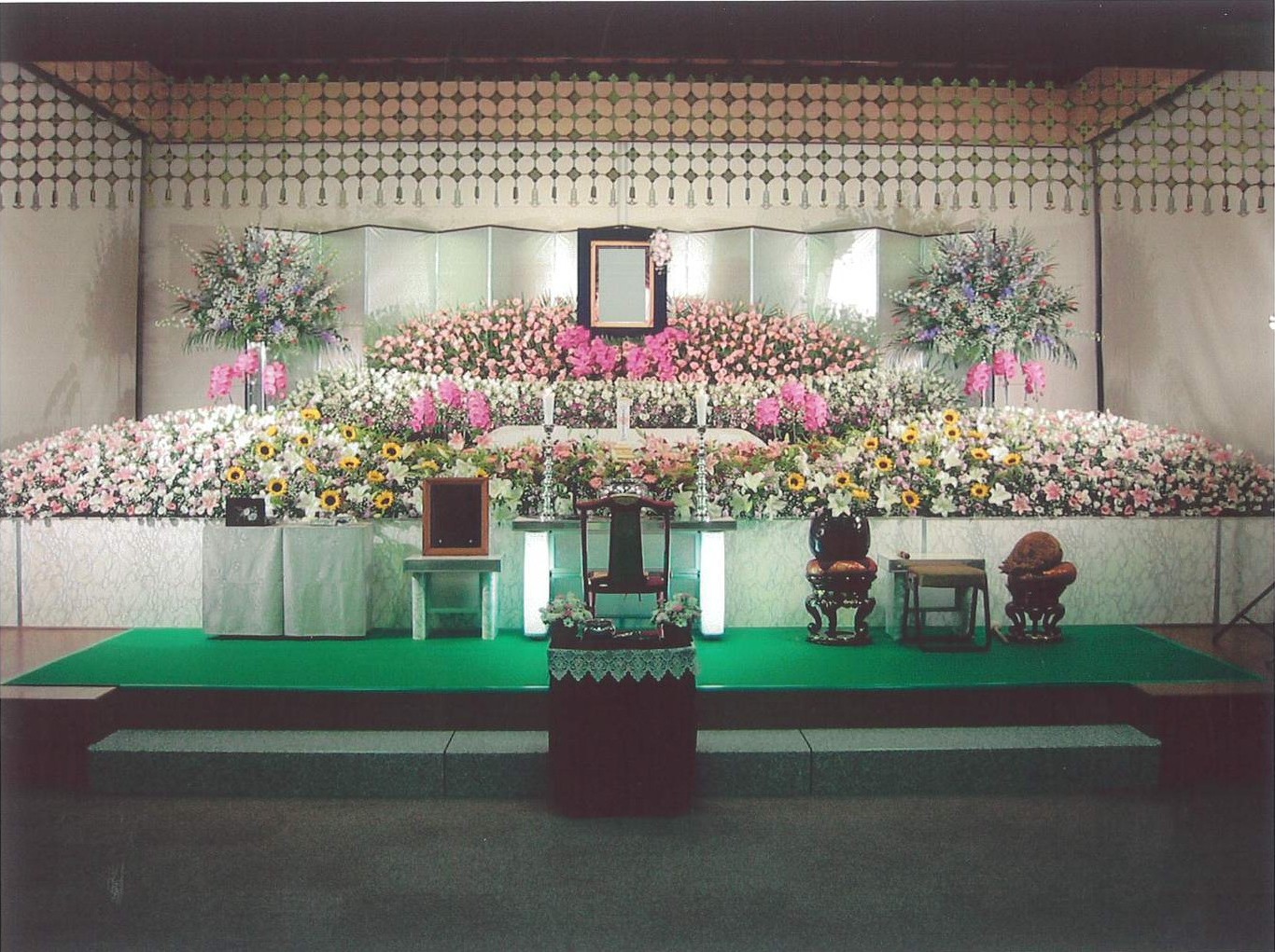 キャデラック霊柩車、蓮華寝棺、大理石または陶七宝の御収骨容器など、
